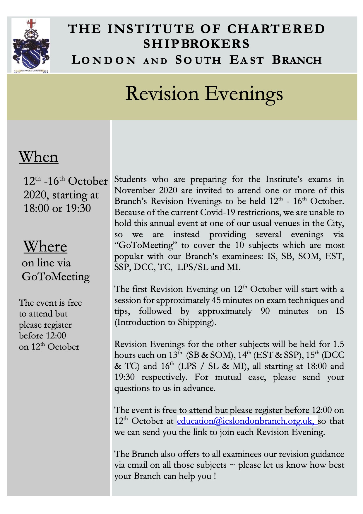 To all Fellows, Members and Students of the Institute of Chartered Shipbrokers London and South East Branch: